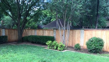 Replaced cedar fence with 1x4 cedar top cap between customer's existing brick pillars. (If any customer desires pillars, either rock or brick, we contract that out, with our specifications, and then build our wood fence between.)