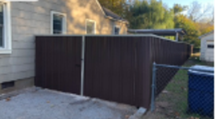These 3 pictures prove the importance of getting references for your fence. R&D ALWAYS provides a list of address references so you can go by and see our fences and the quality of our work. This fence was built for an elderly lady and the fence contractor was recommended to her by one of the online Home improvement companies that lead you to believe the contractors they recommend are veted. This fence is only six months old with gates falling off, and it had to be propped up with 2x4's. They used 1x4's for runners, no brackets or caps on the poles (runners were screwed directly into the poles), and the concrete runner she wanted was installed as cinder blocks with a plaster top cap. The poles were set in the cinder blocks and only about 6" deep. Of course, this fence started falling almost immediately. Her gates fell off in 2 weeks. PLEASE - GET REFERENCES! She had us rebuild this fence, and we felt so bad she had to do so 6 months later. But this fence was garbage! She decided to go back with R-Panel metal, and pictures are below. OUR fence is there to stay! We replaced pickets with R-panel, light weight poles with steel pipe posts, and, of course, used brackets and caps, and properly used treated 2x4 runners. She decided to leave the cinder block footing to save money, but our posts were definitely set 2 1/2' deep in concrete as always. This job was inexcusable, and we consider it elder abuse. We do not tolerate this and you will not see R&D taking advantage of anyone, regardless of age or any other reason. Our reputation depends on it!